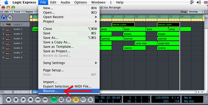 | Go to the "Bounce" function to mixdown the track (picture 4), name the track (example: bass, acoustic guitar, el.guitar, etc.) and use the setting as in picture 5. Make sure that all audio files are recorded at the same sample rate (44.1khz or 48khz) and resolution (16 or 24 Bit). |